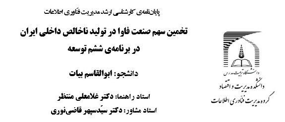 با یاری خداوندگار هستی و راهنماییهای ارزنده استادم آقای دکتر غلامعلی منتظر و مشاوره آقای دکتر سیّدسپهر قاضینوری، در تاریخ نوزدهم دیماه سال جاری از پایاننامه کارشناسی ارشد خود با عنوان «تخمین سهم صنعت فاوا در تولید ناخالص داخلی ایران در برنامهی ششم توسعه» در سالن جلسات پژوهشکده اقتصاد، با درجه عالی (19) دفاع نمودم.